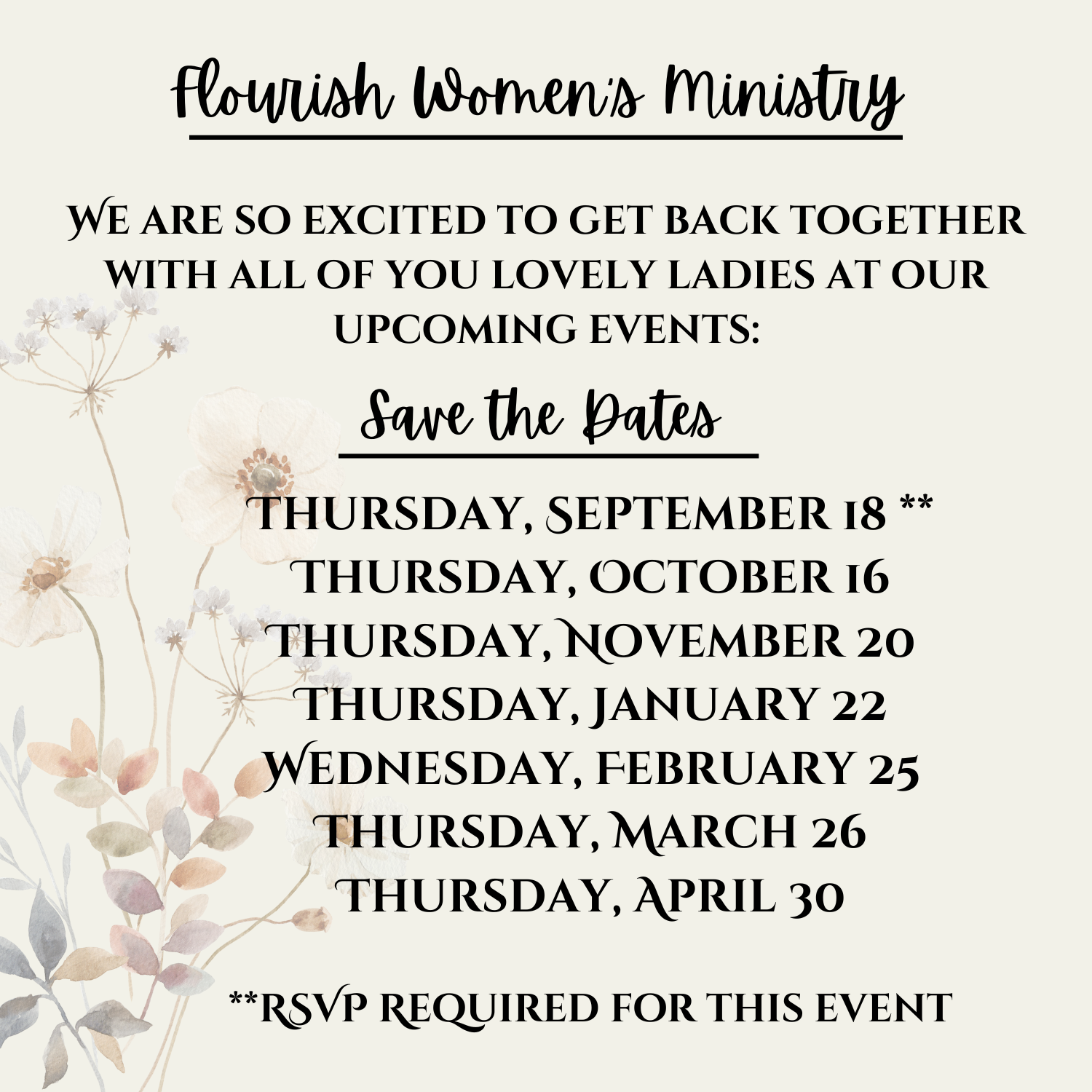 Flourish Women’s Ministry gathers women to grow in fellowship and faith.  Monthly events, talks, Bible Studies, small groups, and more await women of all ages.