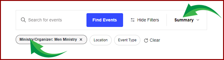To see upcoming Men’s Ministry events, use the “Ministry/Organizer” filter button on the main calendar and choose Men Ministry, and only Men’s events will be visible. Choose summary to see a compact full list. As events approach, more details get filled in.